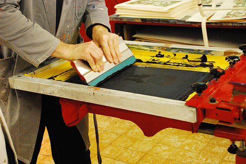 丝网印刷由五大要素构成,即丝网印版、刮印刮板、油墨、印刷台以及承印物。